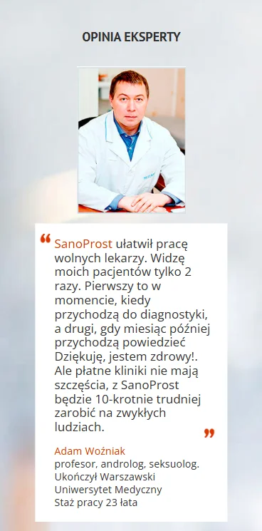 Przyszedłem na wizytę do lekarza z niesmakiem. Myślałem, że teraz dostanę kurs masażu prostaty. Lekarz powiedział, że nie muszę się martwić i od teraz zacznę się leczysz. Dostałem przepis na SanoProst. Po 3 miesiącach czuję się świetnie!